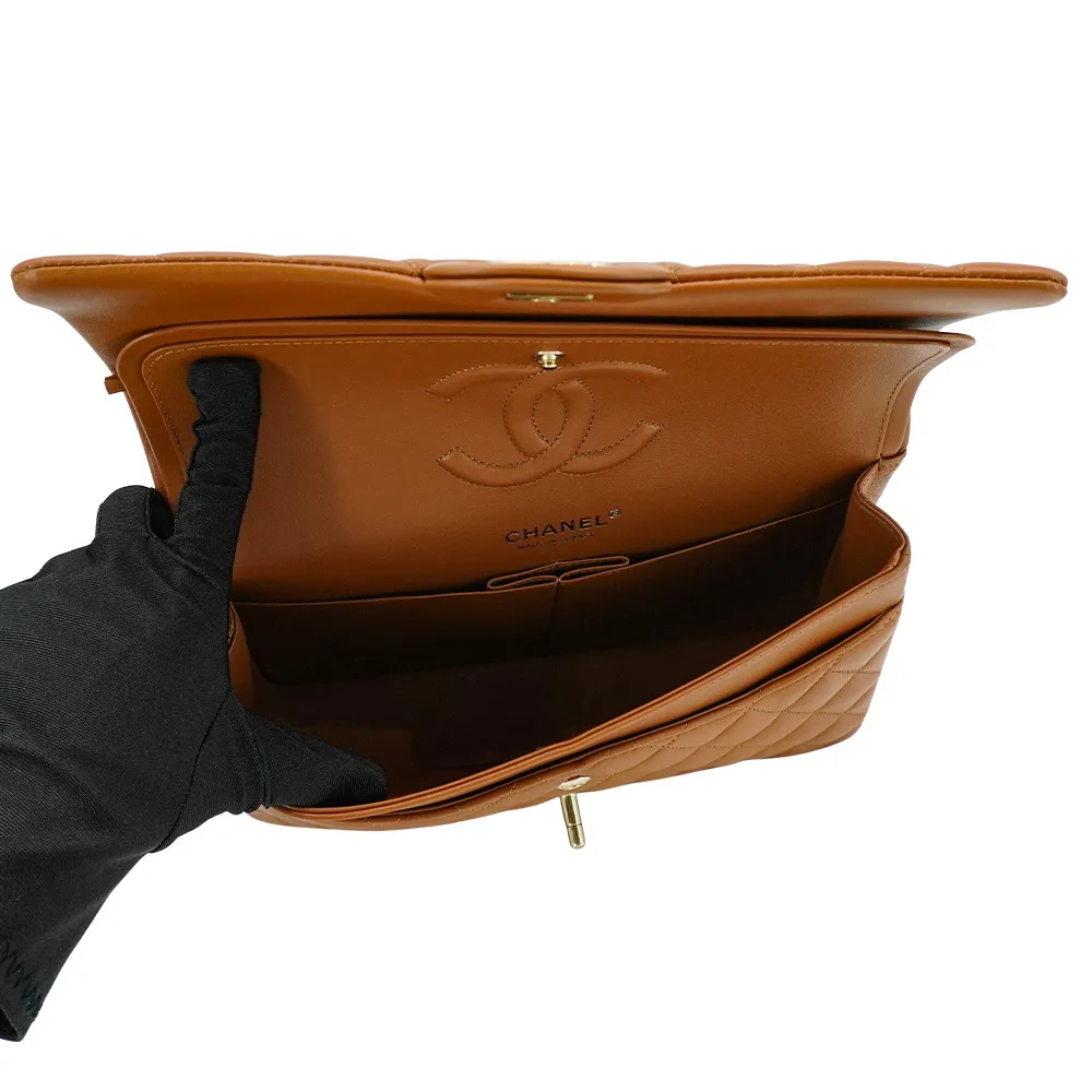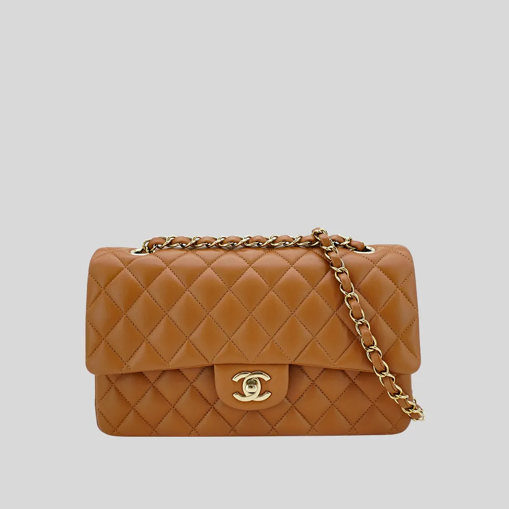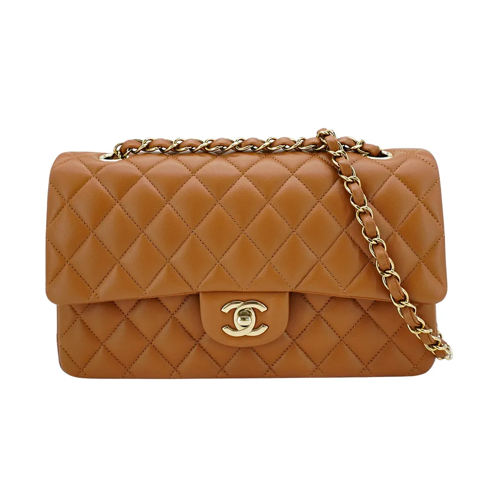 Chanel Coco 雙C菱格羊皮金鍊翻蓋斜背包-25cm(A01112-焦糖棕)